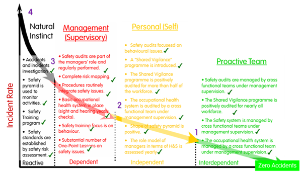 He descrito la Curva de Bradley; no hay otro camino que no sea incrementar la percepción de riesgo de las personas a través de la formación, la práctica, solo completando las actividades necesarias en cada fase podremos llegar a la “interdependencia” y con esta al 0 accidentes, resultado que muestra la madurez de un equipo y que se verá reflejado en el resto de parámetros de la empresa.