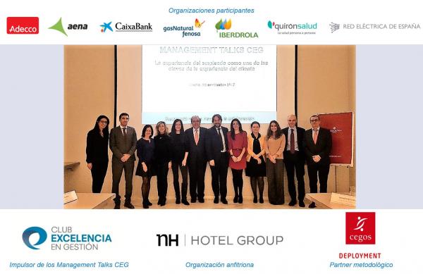 Quizá la experiencia del empleado puede ser una clave para tratar la experiencia del cliente. Ese fue el tema abordado en el Management talk celebrado en la sede de NH y en el que han participado representantes de Adecco, Aena, Caixabank, Gas Natural Fenosa, Iberdrola, Quirón salud y Red Eléctrica de España.