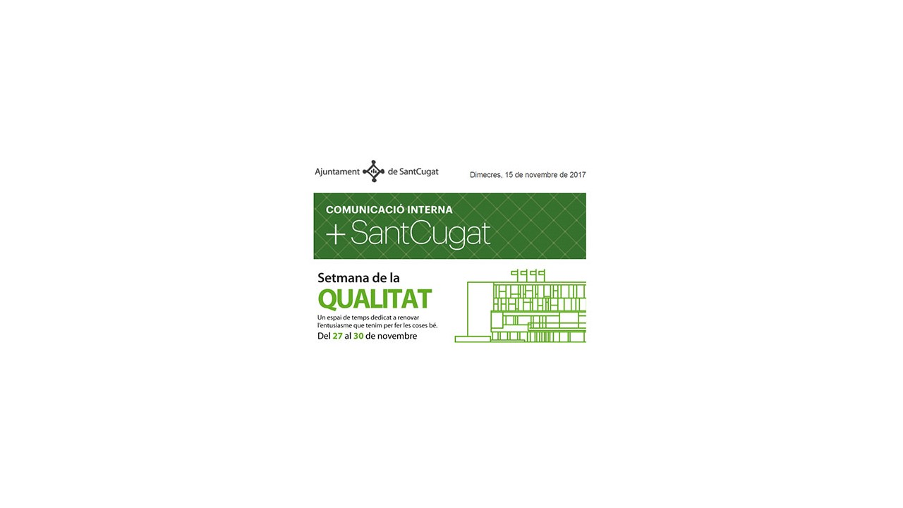 El Ayuntamiento de Sant Cugat ha celebrado la primera edición de la Semana de la calidad, una iniciativa que pretende “dedicar un espacio de nuestro tiempo a renovar el entusiasmo que sentimos para hacer las cosas bien.”